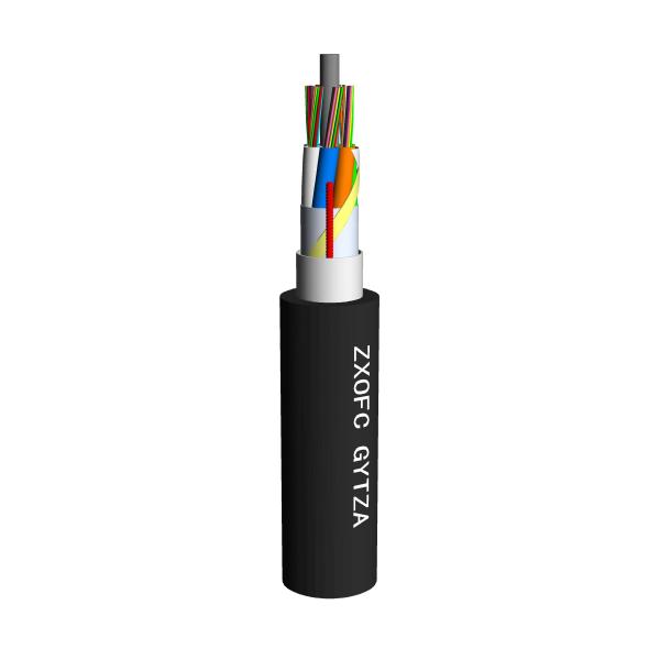 The GYTZA cable is constructed by inserting a 250μm fiber into a loose tube made of a high-modulus material filled with a water-repellent compound. The center of the core is a metal reinforced core. For some cores, a layer of polyethylene (PE) is required to be extruded outside the metal reinforced core. The loose tube (and the filling rope) is twisted around the center reinforcing core into a compact and round core, and the gap in the core is filled with a water blocking filler. After the plastic coated aluminum strip (APL) is longitudinally wrapped, the flame-retardant sheath is extruded into a cable.